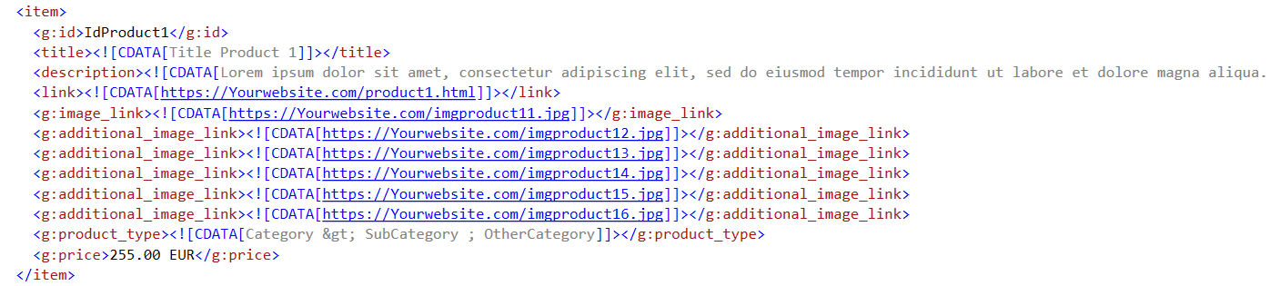 Inside the tag (<item>), we will add the labels corresponding to the basic data of the product. Each (<item>) tag block must be added for each product to be imported.
