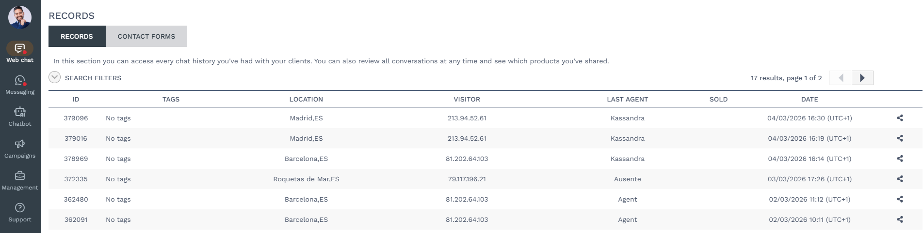 They will also appear with the label you assigned when closing the conversation, the visitor's location, the agent who attended to them, and the date.
