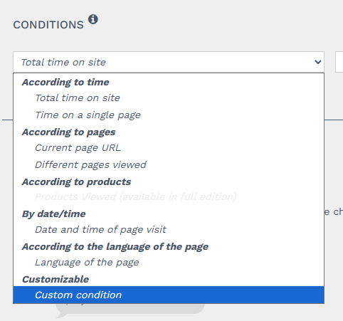 Once we have finished configuring the variables, we need to go to the Oct8ne dashboard and create a new trigger that includes at least one custom condition (as shown in the dropdown menu in the image).