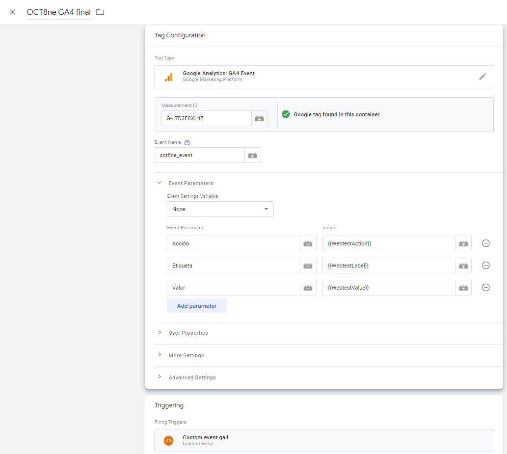 In the Event Name field, we will type oct8ne_event (it is essential that it is written as it appears here). And at the top we will title the trigger with a descriptive name, for example, "EventOct8neGA4".