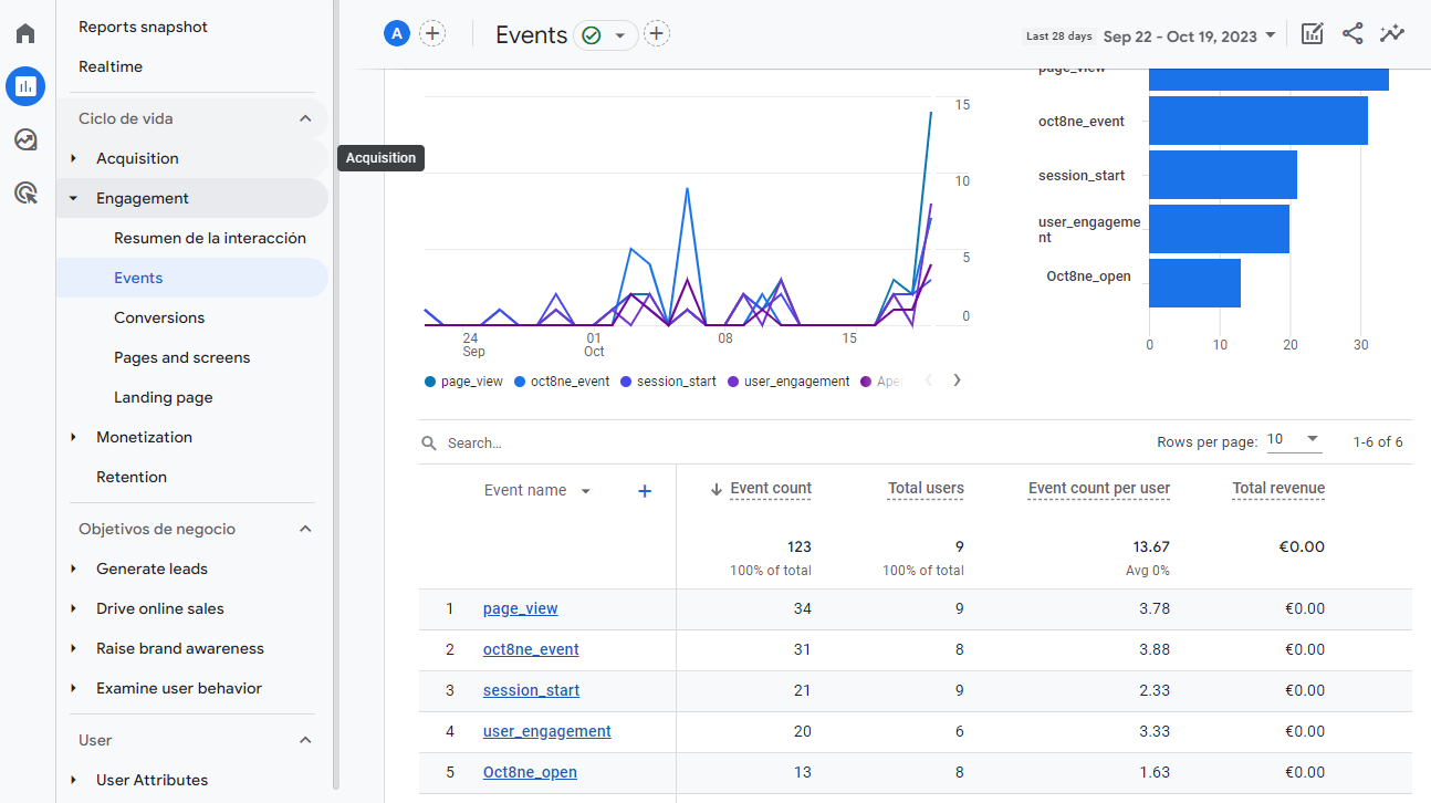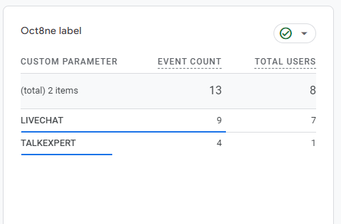 However, you will notice that they arrive grouped under the event name oct8ne_event. By default, GA4 doesn't allow you to drill down to see its Action property (set to GTM), which actually describes the event that has been launched (e.g. Chat Open, Product Viewed, etc.)