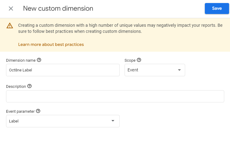 Creating custom dimensions will allow us to access the additional parameter that each Oct8ne event includes, the tag. This dimension will give us more information about the event in question (for example, in the Oct8ne_open event, the label parameter indicates the type of opening).