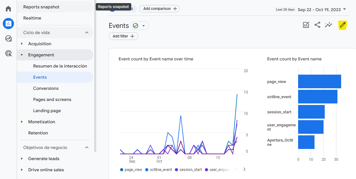 At this point, the events are already displayed in the Google Analytics 4 (GA4) dashboard, in the Reports section.