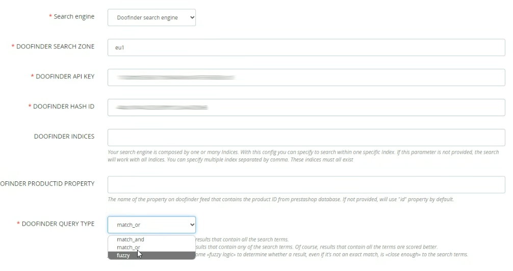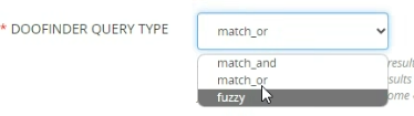 Por último, en el campo ‘DOOFINDER QUERY TYPE’, es el que define el tipo de búsqueda que esta configurado en tu panel de Doofinder (por defecto, fuzzy). Se puede modificar mediante este selector.