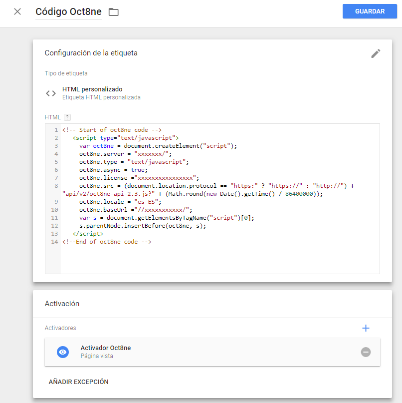 - Seleccionamos un nombre descriptivo para el activador (p.ej. Activador Oct8ne), guardamos y a continuación clicamos en la opción del menú principal Etiquetas.