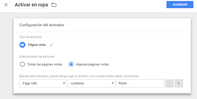 - Clicamos en la zona de Configuración del Activador y seleccionamos la opción Página Vista en la lista que aparece a la derecha de la pantalla.